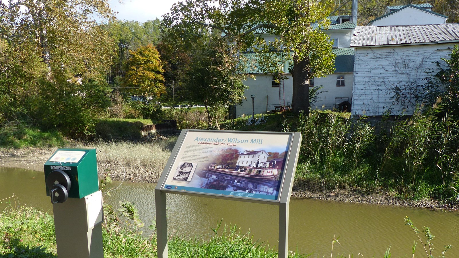 Falling water provides power. If you can capture that energy with a waterwheel, you can use it to grind grain and make a living. About 1853, the Alexander family built a grist mill here. In time, they replaced the waterwheel with more efficient turbines. Around 1900, the Alexanders sold the business to the Wilsons. After 70 years of using waterpower, the Wilsons switched to electric motors. Today, the family sells pre-bagged feed and fertilizer. Crank the handle on the audio player to hear “Skip” Wilson talk about the mill’s history.