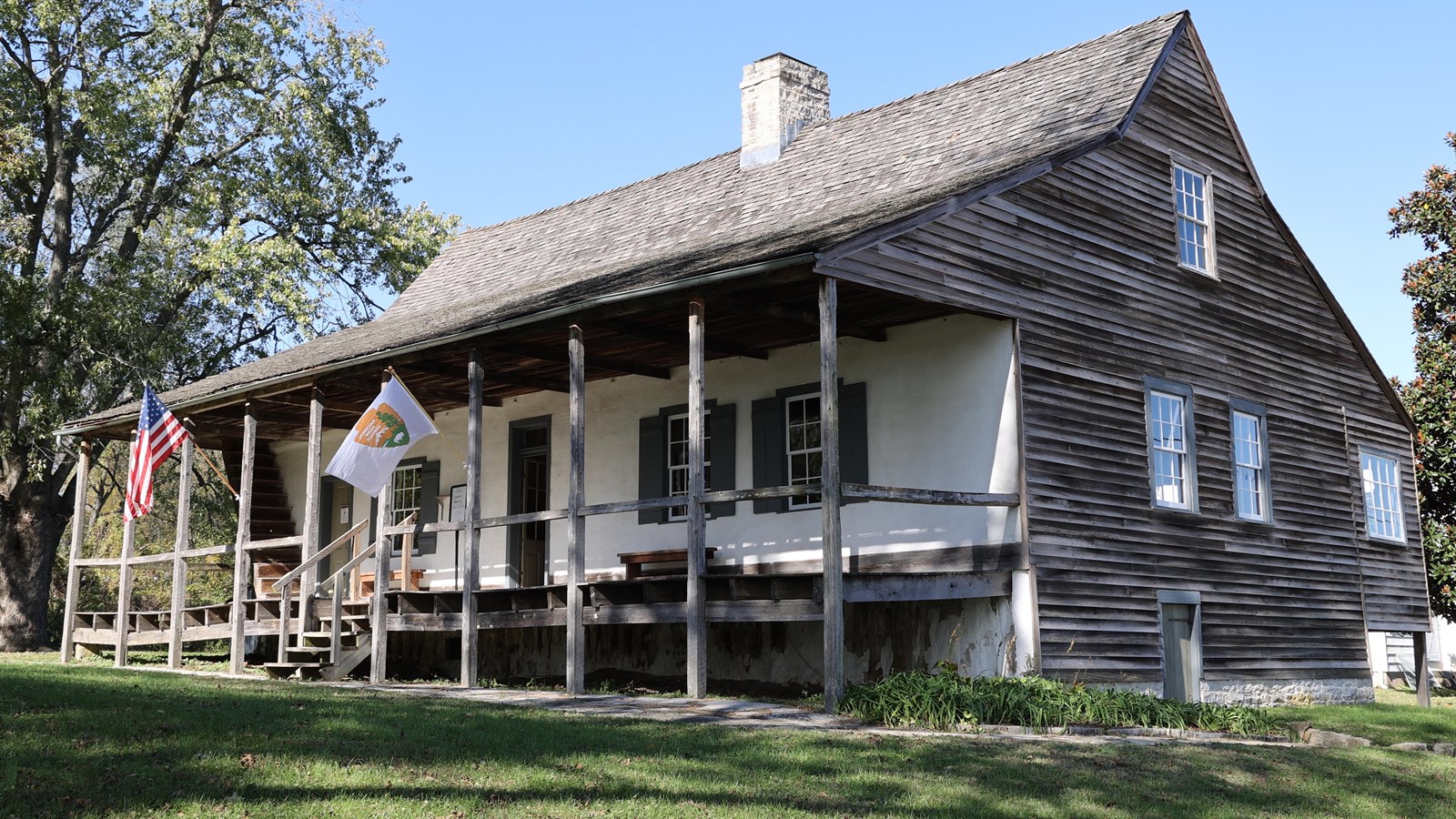 The Bauvais-Amoureux House demonstrates a unique form of construction, poteaux-en-terre (post-in-ground), which means the vertical logs that make up the home are foundational. Today, only three poteaux-en-terre houses remain in Ste. Genevieve with five total known to remain in the United States. Another important architectural feature is the heavy timber trusses supporting the steeply pitched roof. The walnut ceiling beams are original, and the date of the construction has been confirmed by dendrochronology. The house was shortened, and interior alterations were made in the 1840s. While the house looks different today than it did when it was built, it is a great example of the post-in-ground vertical log construction.