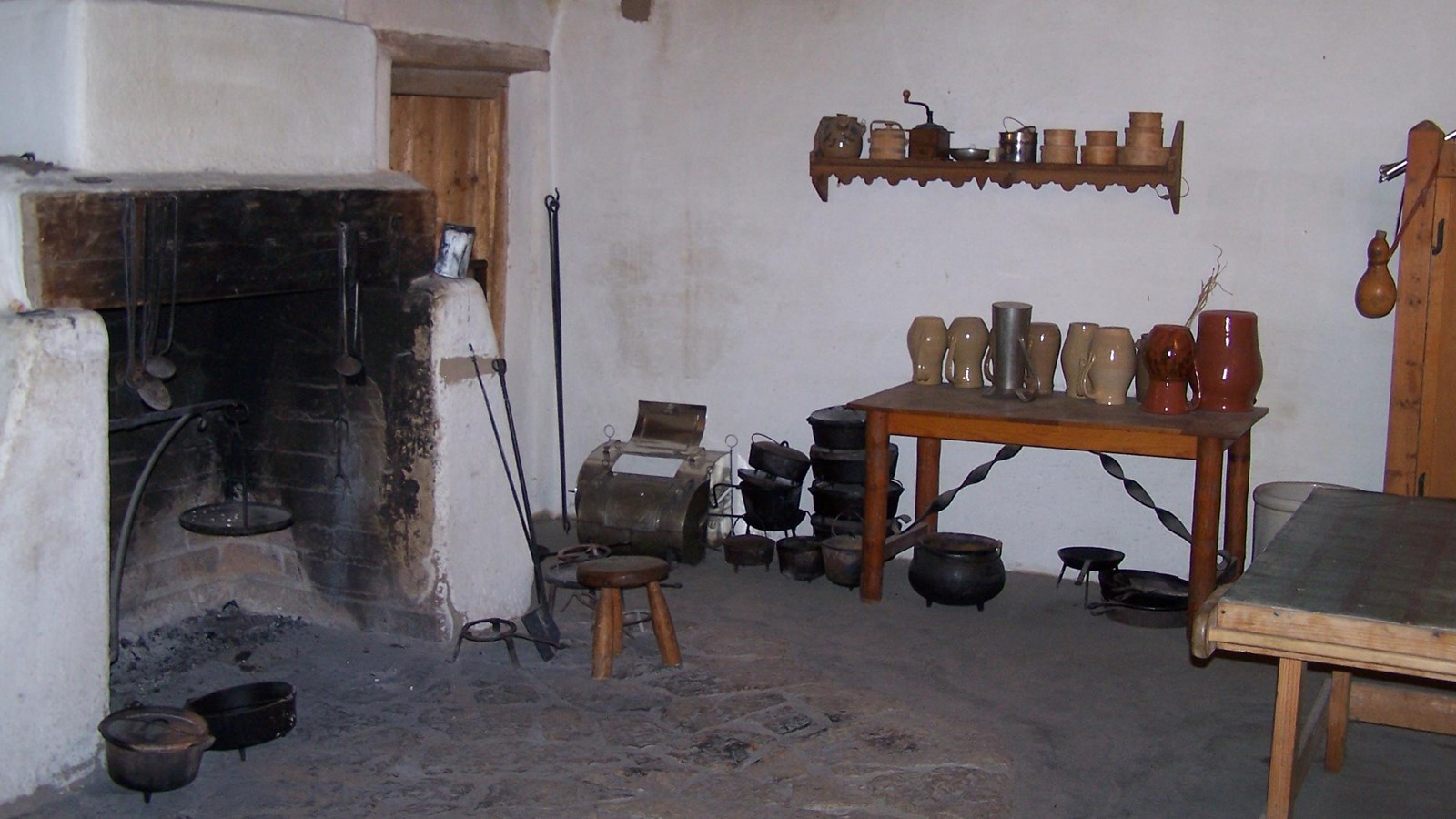 Scattered are dutch ovens, an iron ladle, a tin reflector oven, fireplace pokers and hooks, a trivet, crockery, and a variety of spits and other cooking utensils. Try to imagine the smells that visitors to the old fort would have noticed: cottonwood smoke, spices, and grease drippings, or perhaps the rank odor of spoiled meat and rotting foodstuffs. One can only guess at the rush required to feed several dozen occupants of the fort at each meal. Amidst flying towels, steam, and clanging pots one could find the cooks, hurried in their preparation for meal to support the fort's workforce.