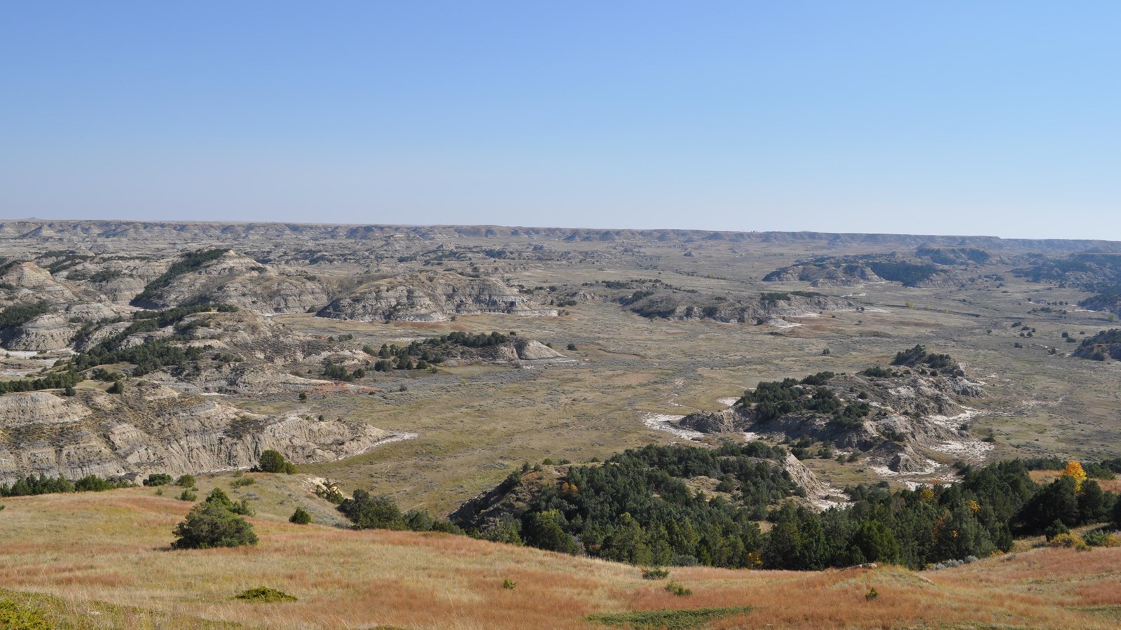 The South Unit of Theodore Roosevelt National Park offers many incredible scenic views, but none have quite the same scope as the view from the top of Buck Hill. One of the highest points in the park, climbing to the top offers a beautiful 360° view. On clear days, one can see for miles, from Painted Canyon to Boicourt and beyond, all by simply turning in a circle.