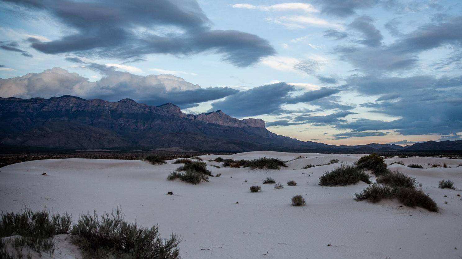 The white gypsum sands of the Salt Basin Dunes rise 100 feet from the desert floor and provide a brilliant contrast to the dark, towering cliffs of the Guadalupe Mountains. To the west are barren salt flats that are the source of these beautiful dunes. When rain runs off the highly soluble limestone rock in the adjacent mountains, salts are leached. This runoff pools in the desert basin and as it evaporates, large grains of mineral salts are left behind. The wind carries the salt grains northeast toward the Guadalupe Mountains and deposits them at the base of the western Guadalupe escarpment to form gypsum dunes.