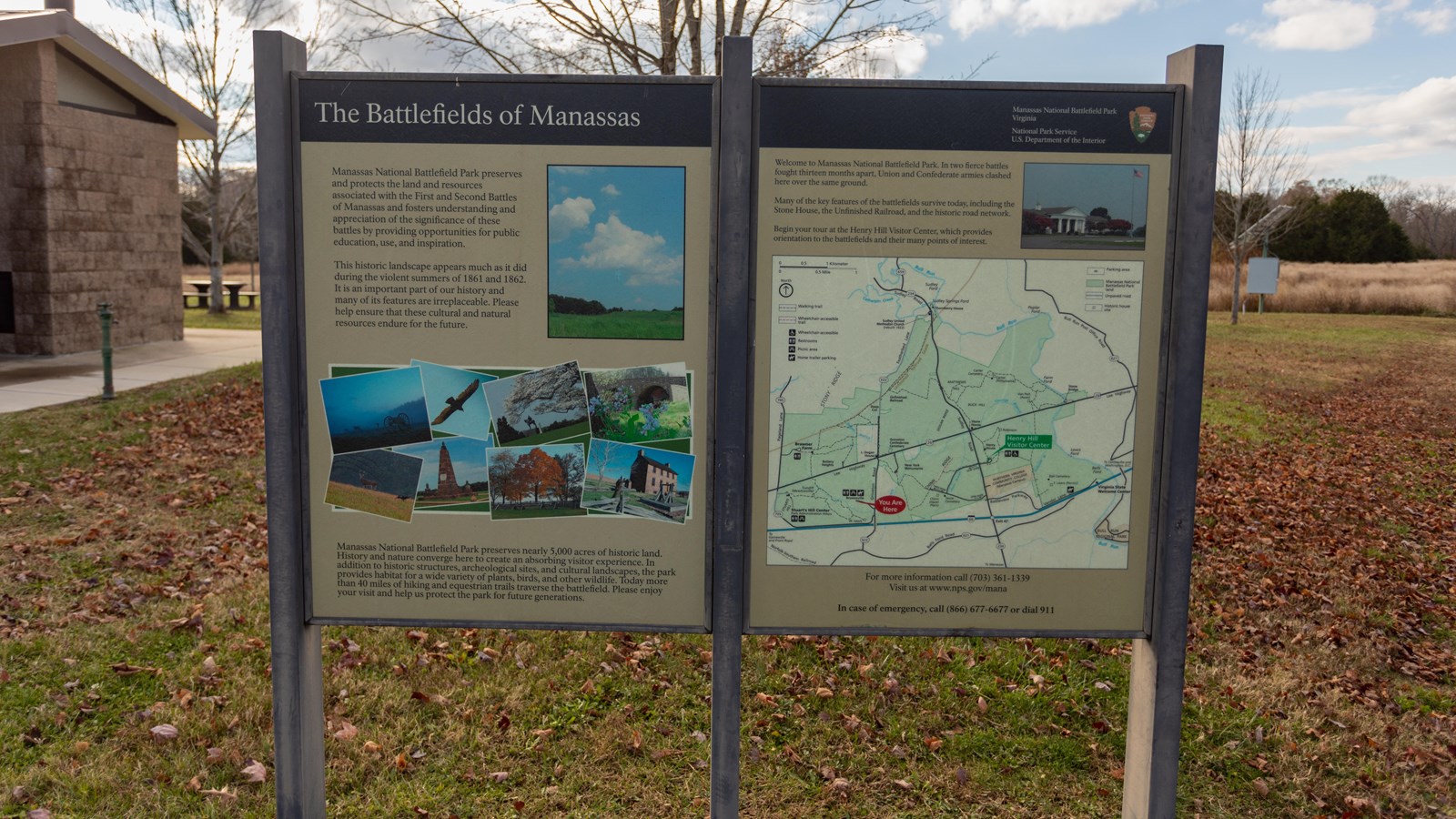 Manassas National Battlefield Park preserves nearly 5,000 acres of historic land. History and nature converge here to create an absorbing visitor experience. In addition to historic structures, archeological sites, and cultural landscapes, the park provides habitat for a wide variety of plants, birds, and other wildlife. Today more than 40 miles of hiking and equestrian trails traverse the battlefield. Please enjoy your visit and help us protect the park for future generations.