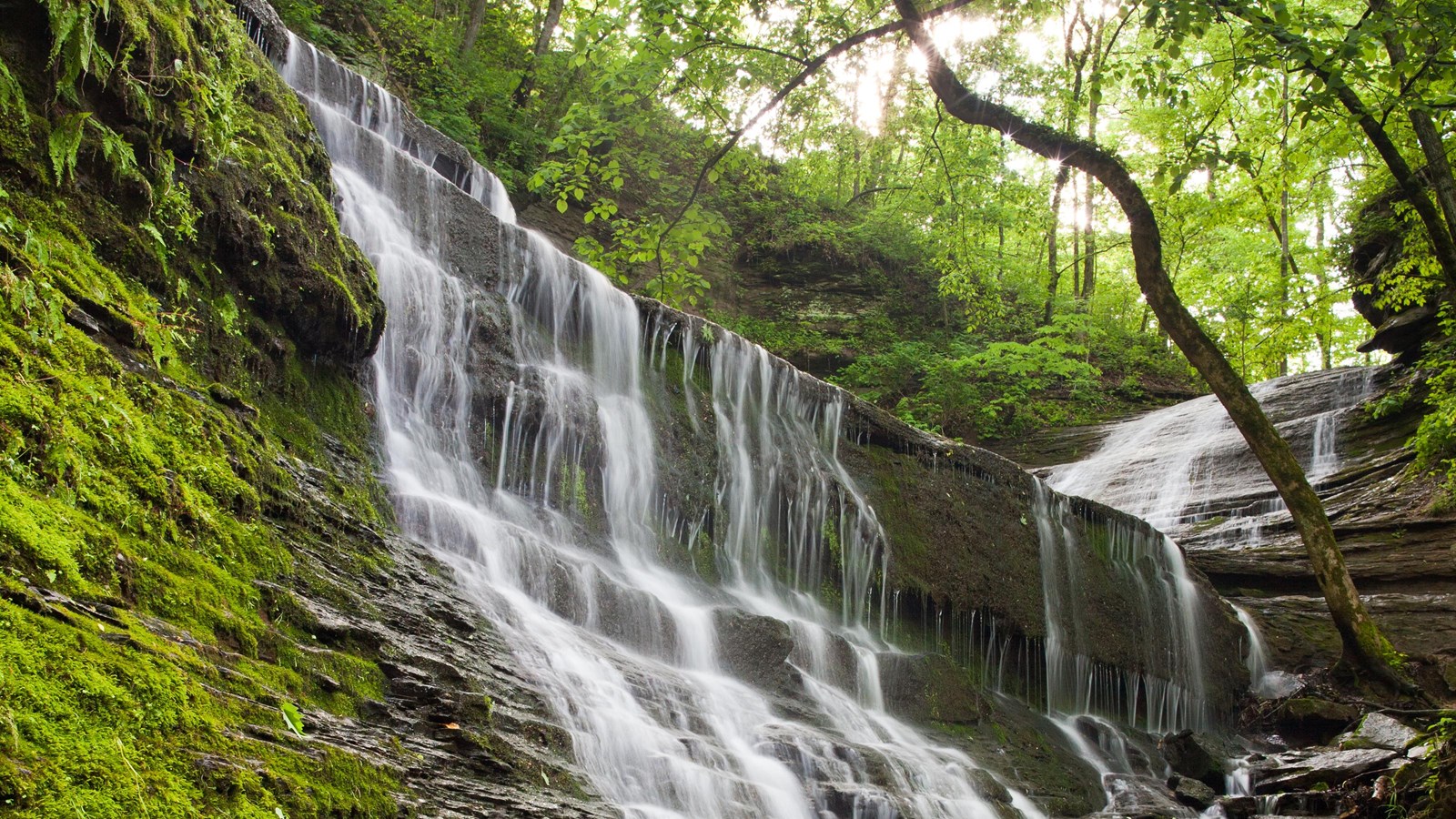 A steep trail (concrete sidewalk) 900 feet long takes you to a clear pool at the base of these falls. This trail descends to Jackson Falls a beautifully sculptured cascade. This is one of two waterfalls along the Natchez Trace Parkway. The other waterfall is Fall Hollow located at milepost 391.9 near Hohenwald, Tennessee.