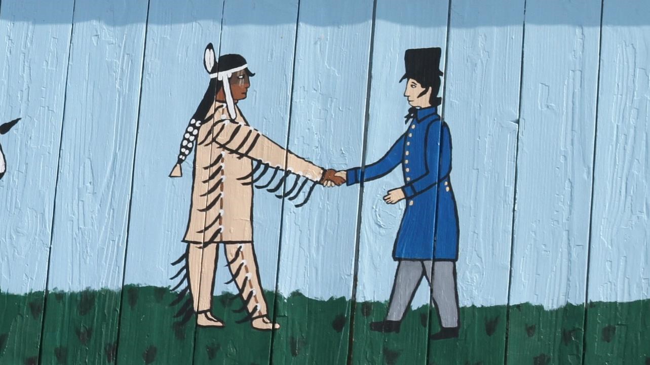 The mural depicts a painting of eight people gathered for trade negotiations. In the center, an American Indian and a trader are shown shaking hands in a cordial manner. The left side of the image shows three American Indians watching the meeting, while the right side shows three white traders observing the proceedings. The mural's centerpiece is a powerful painting of a golden-brown eagle clutching a greenery branch and four arrows in its talons, symbolizing the strength and unity of the tribes involved in the treaty. The eagle image is shown hovering above the trade negotiations, underscoring the importance of the treaty and its significance in the history of the region.