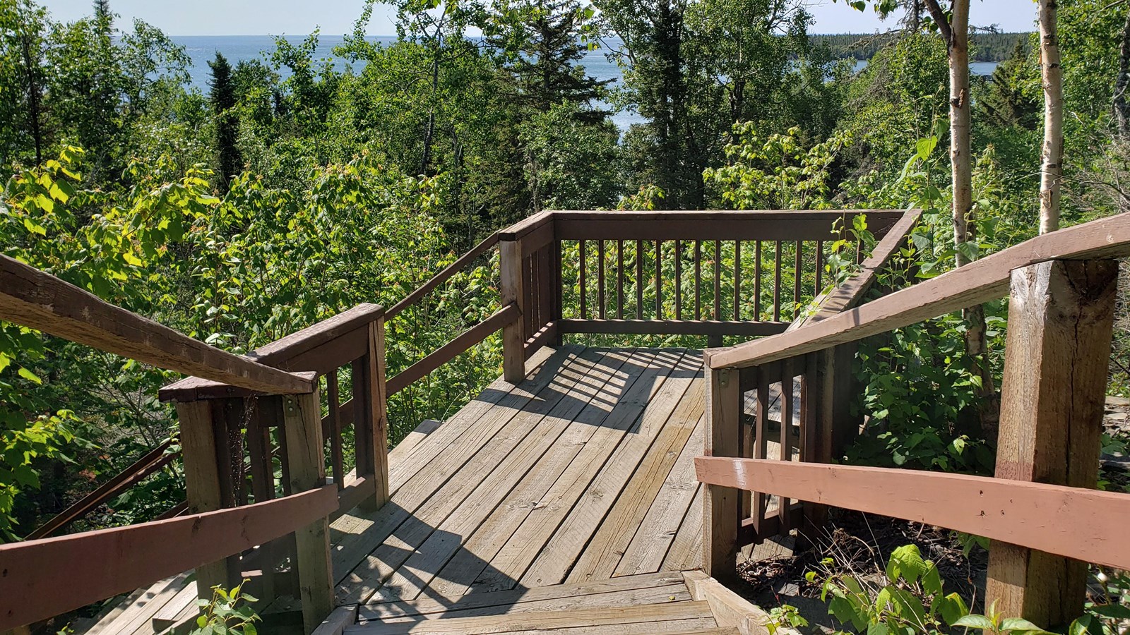 After the first three flights of stairs (about 60 steps), you come to a landing with a view of Grand Portage Bay and Raspberry Point. In early summer, take a moment to watch birds fly around in the tops of the trees below the landing. The bench is a good opportunity to catch your breath or enjoy a moment of quiet.