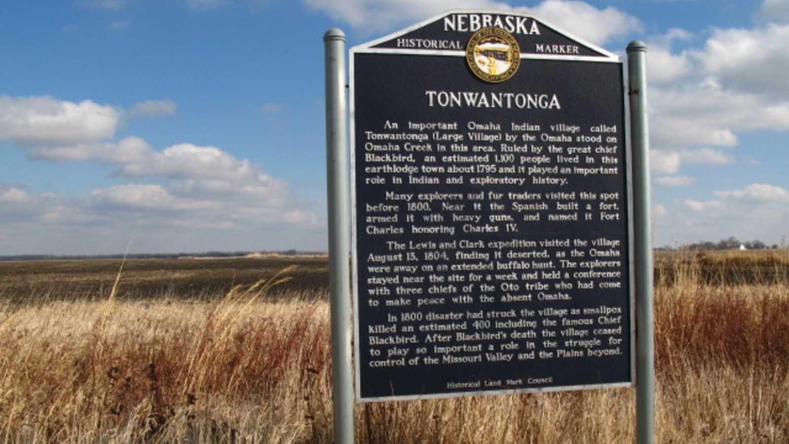 Located near present-day Homer, Nebraska, the Omaha Big Village was founded circa-1775. The Omaha Tribe thrived under Chief Blackbird, controlling the fur trade on the Upper Missouri River. By 1795, their village had grown to approximately 1,100 people. That same year, James Mackay established a nearby fur trading post for the Spanish, known as Fort Charles. (Although the post operated for only a few years, Clark mapped its location in 1804, indicating that remnants remained intact.) By 1800, a smallpox epidemic killed approximately one-third of the tribe’s population, including Chief Blackbird. The diminished village was occupied until 1845. The Omaha Big Village archeological site is located on private property, with restricted public access, but may be publicly viewed from a pull-off along US-75.