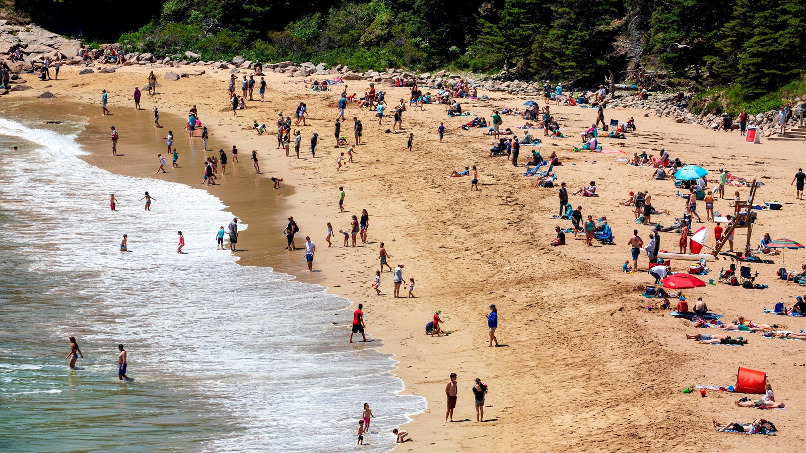 Sand Beach is a popular summertime destination on Park Loop Road. Surrounded by cliffs, this small stretch of coast is the largest sandy beach in Acadia. Come relax by the waves, or head out on a nearby trail. In summer, the free Island Explorer shuttle makes frequent stops here. Parking, however, often fills early in the morning.