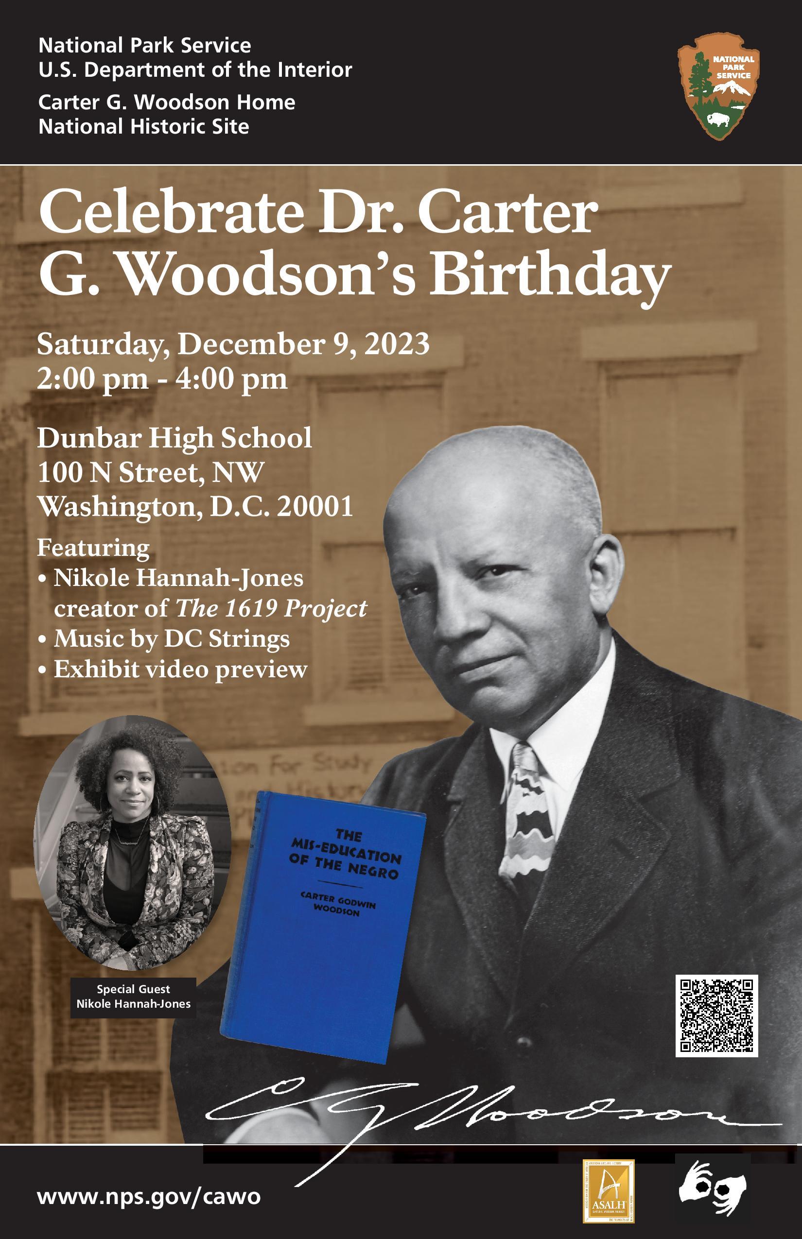 Join the National Park Service and the Association for the Study of African American Life and History, Inc. (ASALH), as we come together to celebrate the 148th anniversary of the birth of "the Father of African American History", Dr. Carter Godwin Woodson and the 90th Anniversary of his most important work, The Mis-Education of the Negro.