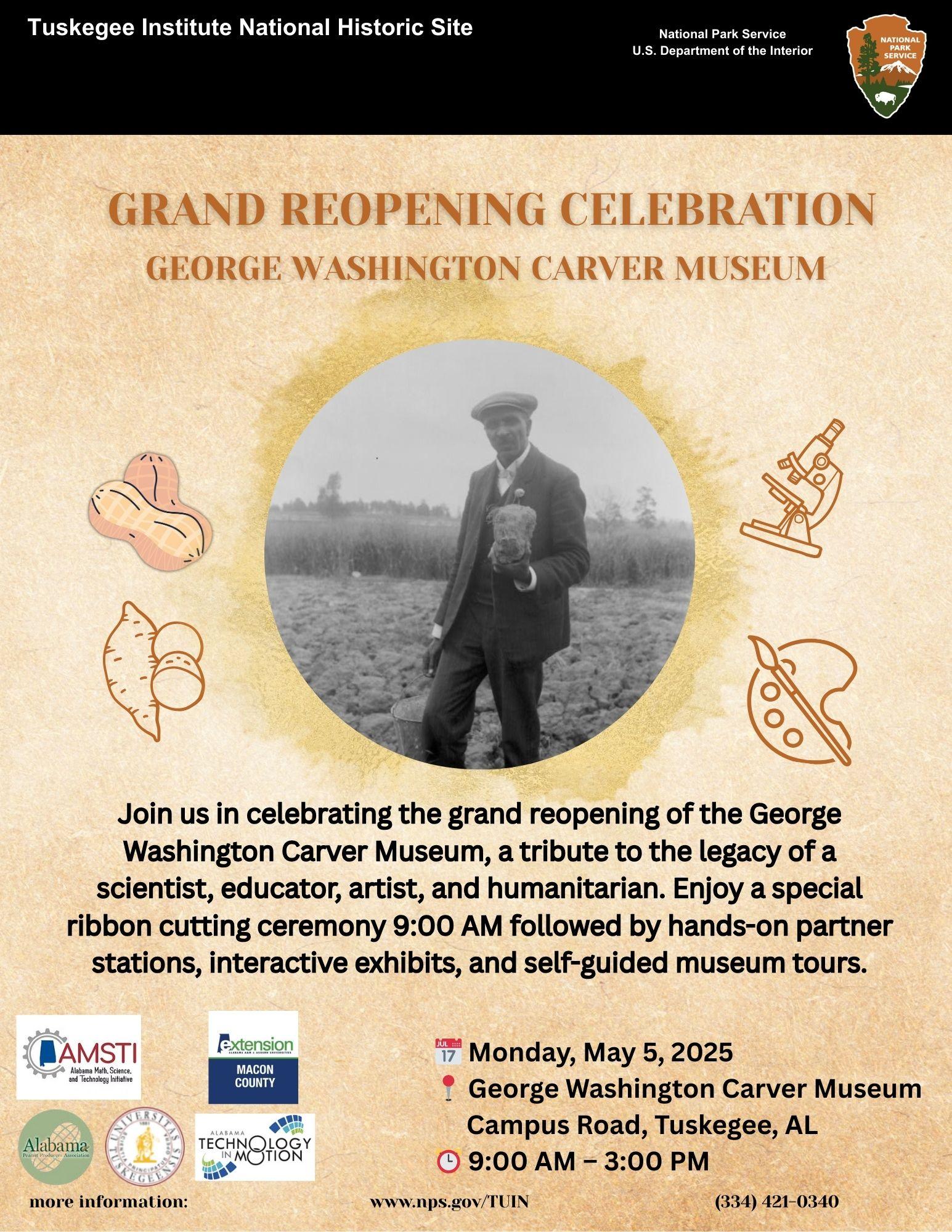 Join the Tuskegee Institute National Historic Site for the grand reopening of the George Washington Carver Museum—a day dedicated to honoring the legacy of Dr. Carver’s scientific and educational contributions. The celebration will begin with a ribbon cutting ceremony at 9:00 AM, followed by guided museum tours, engaging partner-led activity stations, and interactive exhibits for students and visitors of all ages.