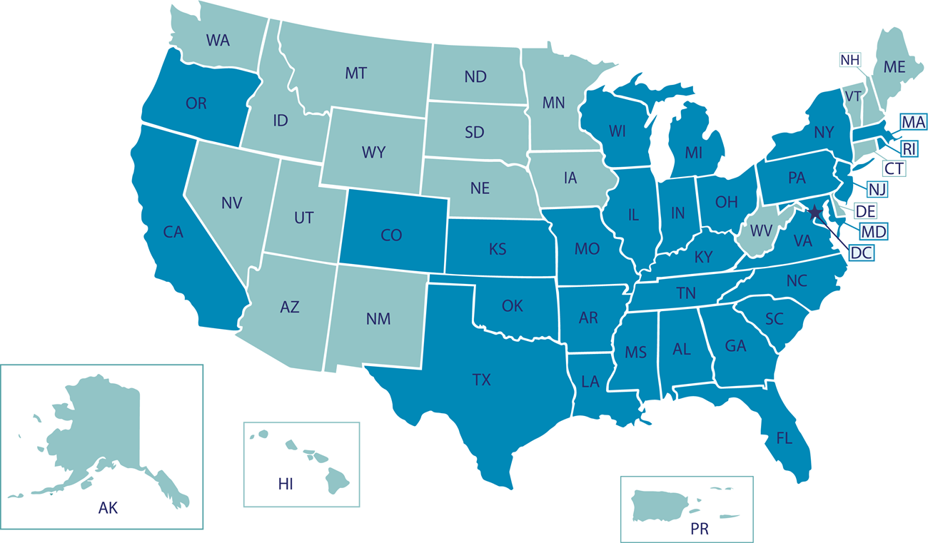Alabama | Arkansas | California | Colorado | District of Columbia | Florida | Georgia | Illinois | Indiana | Kansas | Kentucky | Louisiana | Maryland | Massachusetts | Michigan | Mississippi | Missouri | New Jersey | New York | North Carolina | Ohio | Oklahoma | Oregon | Pennsylvania | Rhode Island | South Carolina | Tennessee | Texas | Virginia | Wisconsin