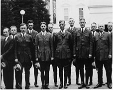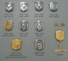 Ranger badges, collar insignia, and name bars are important parts of the official niform. Hat bands, belts, tie tacks, and other ornamentation complete the "ranger look". Each of the three NPS symbols created since 1916—the eagle, the sequoia cone, and the arrowhead—can still be seen on uniforms today if you know where to look. Historically, sleeve insignia defined rank among employees in the 1920s and 1930s, and leather puttees were stylish safety accessories. Explore our virtual exhibit of NPS badges to learn more.