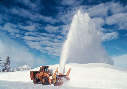 Rotary snowplow clears the road at Crater Lake National Park in Oregon.