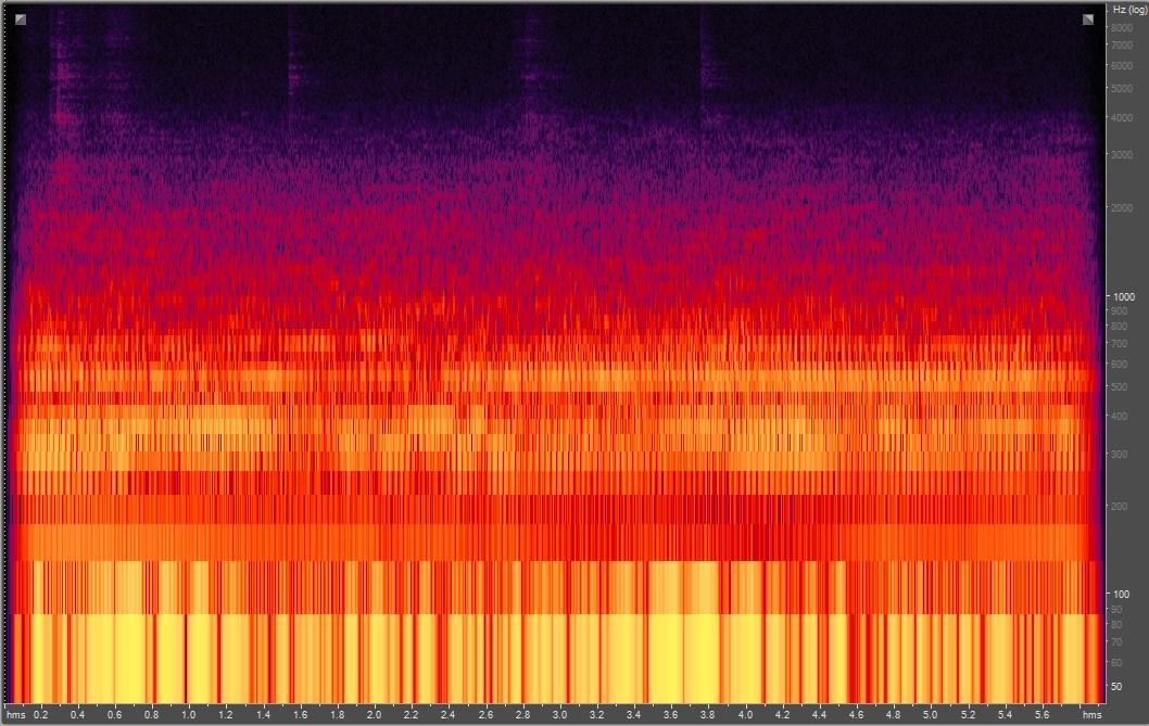 Spectrogram of rotary snowplow. Spectrograms are graphs that visualize sounds. The brightness of the colors shows sounds’ amplitude (loudness) across different frequencies (pitches), shown from bottom to top, and over time, from left to right.