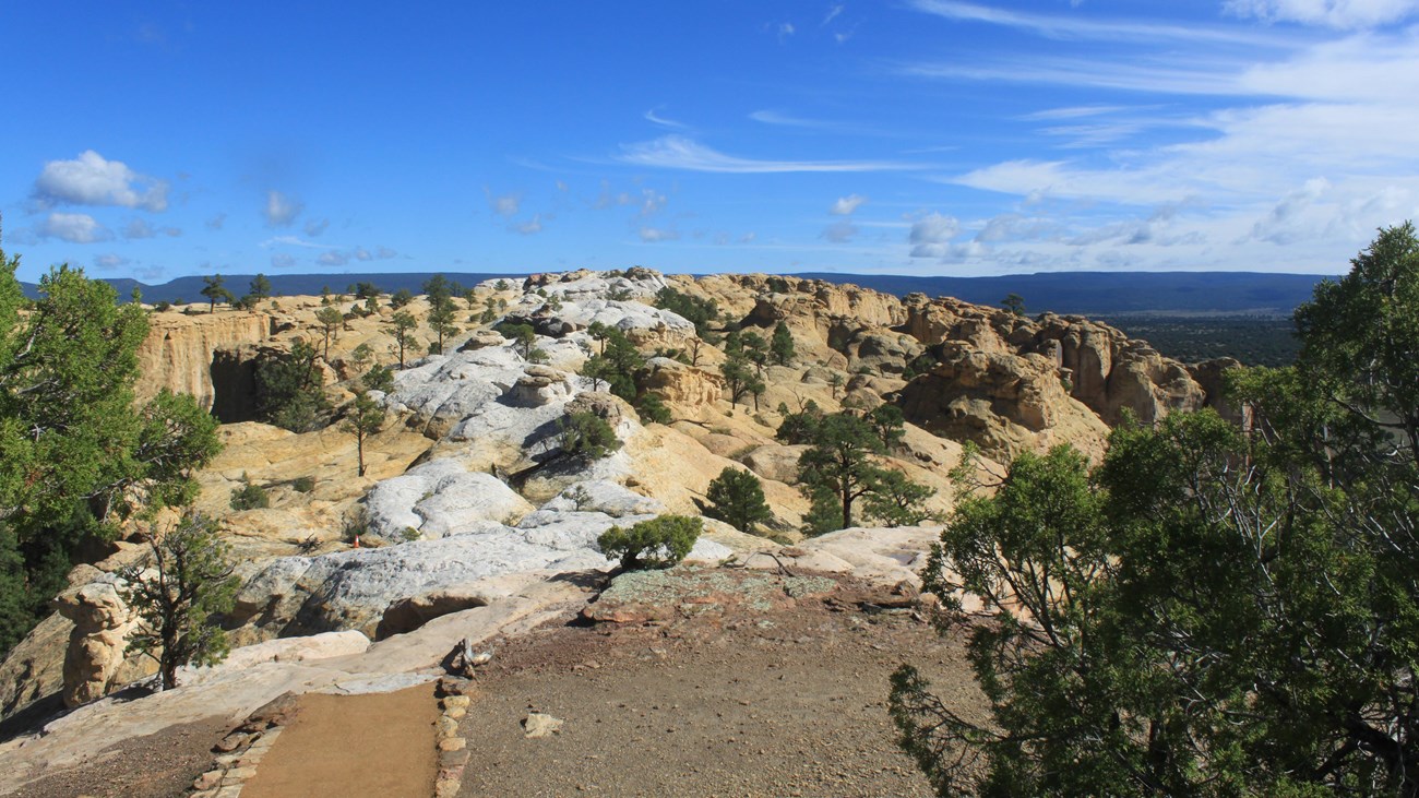 This 2-mile trail includes the Inscription Loop and takes you to the top of the El Morro bluff. It is a moderately strenuous trail with a gain of 224 ft of elevation. Hikers can choose to ascend via switchbacks or 132 stairs. At the top of the bluff, there are two ancestral Puebloan dwellings, one of which is partially excavated. Much of the upper section of the trail is on uneven sandstone so sturdy footwear is recommended.