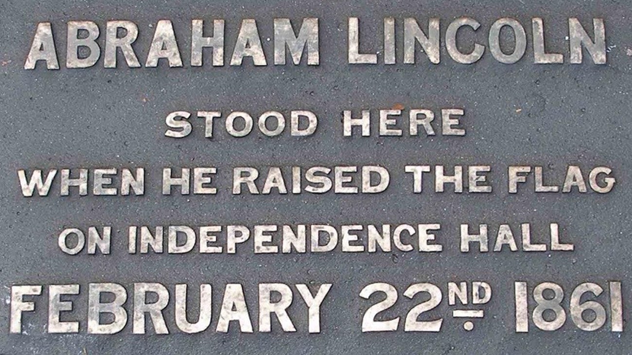 When President-elect Abraham Lincoln stepped into Independence Hall in 1861, he found a shrine to the founding of the nation, proudly displaying the Liberty Bell and original paintings of the Founding Fathers. Standing in the Assembly Room, he said that he would rather be "assassinated on the spot" than give up the ideals of the Declaration of Independence. That day, he also raised the flag in front of Independence Hall. Today, a plaque located on the east side of the statue of George Washington marks the spot.