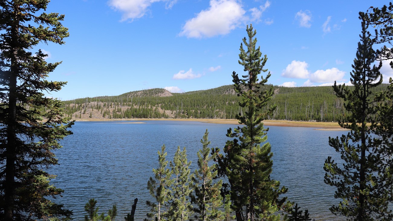 The trail crosses the Firehole River, passes Pipeline Hot Springs, and climbs rolling hills of partially-burned lodgepole pine and open, rocky areas to the lake.