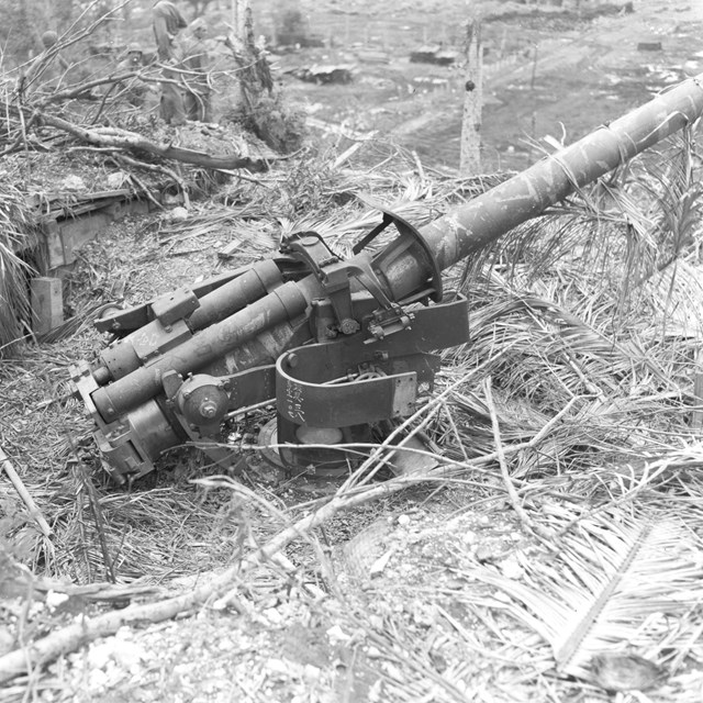 In the months before W Day, three Vickers-type Model 3 140mm coastal defense guns were installed in emplacements in the Piti hills. They were meant to drive back American ships and landing craft attempting to land in Apra Harbor. Also known as 14cm/50 3rd Year Type guns, these were the most common coastal defense weapons used in the Pacific Islands.