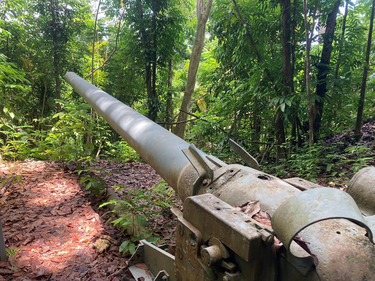 Heavy bombardment and intense fighting before and during the battle devastated the island, destroying homes, burning vegetation, and damaging the fortifications. Today, most of those fortifications are either gone or in ruins, but in the hills overlooking the village of Piti, three Vickers-type Model 3 140mm coastal defense guns still rest silently in a mahogany forest. They are the only guns in War in the Pacific National Historical Park that remain in their original emplacements.