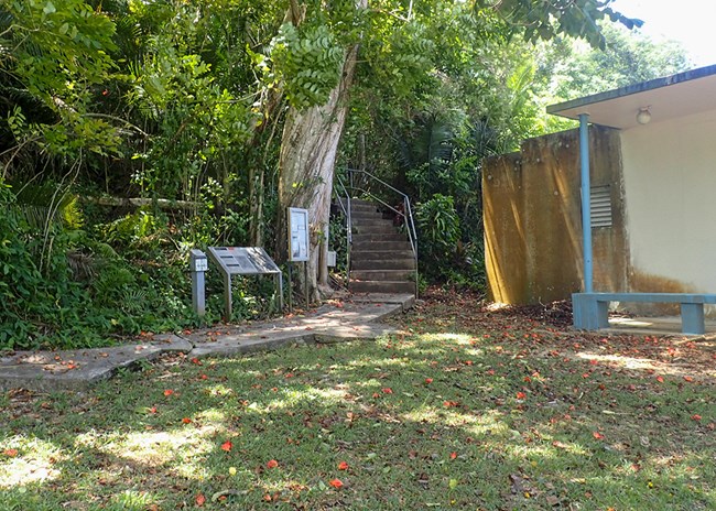 The Piti Guns Unit parking lot is located next to the Assumption of Our Lady Church social hall. The trailhead is just behind the wayside exhibit at the base of the hill.