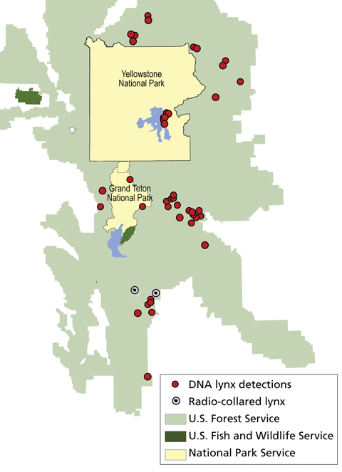 NPS Historical information suggests lynx were present, but uncommon, in Yellowstone National Park during 1880 to 1980. The presence and distribution of lynx in the park was documented during 2001 to 2004, when several individuals were detected in the vicinity of Yellowstone Lake and the Central Plateau. A lynx was photographed in 2007 along the Gibbon River, and another lynx was observed near Indian Creek Campground in the northwestern portion of Yellowstone during 2010. Tracks of an individual were verified near the Northeast Entrance in 2014. Reliable detections of lynx continue to occur in surrounding National Forest System lands. Evidence suggests lynx successfully reproduce in the GYE, though production is limited. In 2000, the US Fish and Wildlife Service listed the lynx as “threatened” in the lower 48 states. Portions of the park and surrounding area is considered much of the critical habitat for the species in the Greater Yellowstone Ecosystem. HabitatLynx habitat in the Greater Yellowstone Ecosystem is often naturally patchy due to natural fire frequency and generally limited to conifer forests above 7,700 feet where the distribution of its primary prey, snowshoe hare, is often insufficient to support lynx residency and reproduction. The lower quality habitat means home ranges in this ecosystem are larger than those farther north, with lynx traveling long distances between foraging sites. ResourcesMurphy, K., T. Potter, J. Halfpenny, K. Gunther, T. Jones, and R. Lundberg. 2005. The elusive Canada lynx: Surveying for Yellowstone’s most secretive threatened carnivore. Yellowstone Science 13(2): 7–15. Murphy, K.M., T.M. Potter, J.C. Halfpenny, K.A. Gunther, M.T. Jones, P.A. Lundberg, and N.D. Berg. 2006. Distribution of Canada Lynx in Yellowstone National Park. Northwest Science 80(3):199–206. Murphy, S.C. and M.M. Meagher. 2000. The status of wolverines, lynx, and fishers in Yellowstone National Park. In A. P. Curlee, A. Gillesberg and D. Casey, ed., Greater Yellowstone predators: Ecology and conservation in a changing landscape, 57–62. Northern Rockies Conservation Cooperative and Yellowstone National Park. Ruggiero, L.F. et al. ed. 2000. Ecology and Conservation of Canada Lynx in the US. Boulder: University of Colorado. Squires, J.R. 2005. Conservation challenges of managing lynx. Yellowstone Science 13(2): 10–11. Squires, J.R. and R. Oakleaf. 2005. Movements of a male Canada lynx crossing the Greater Yellowstone Area, including highways. Northwest Science 79(2–3):196–201. |